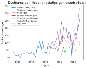 Figuur 2. Deelname aan Nederlandstalige genrewedstrijden, 1977–2025.